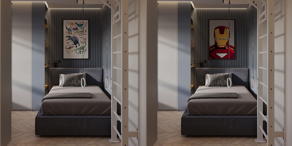 В одной из детских мы предложили для оформления стены иллюстрацию динозавров или любимого супергероя — ребенок увлекался палеонтологией и обожал фильмы Марвел. В другом проекте в гостиной мы оформили открытую полку для коллекционных фигурок клиента. Это не просто игрушки — это элемент идентичности и тема для разговора, которая сразу «цепляет».