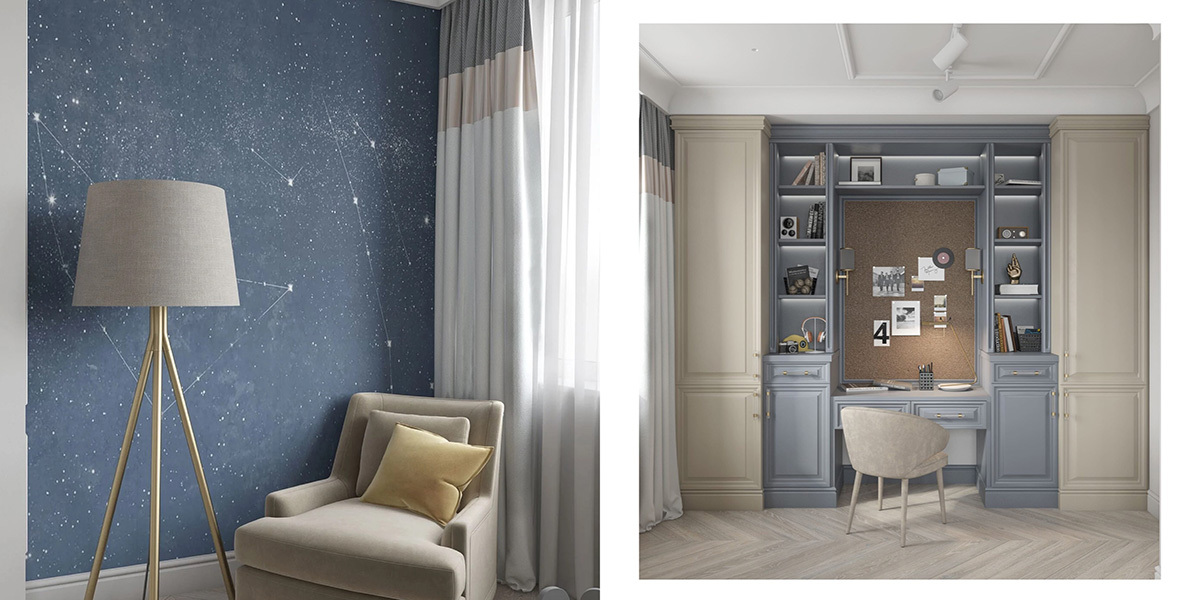 Например, в одном проекте подростковой комнаты клиент увлекался астрономией. Мы использовали авторские обои, которые создал художник, с изображением звёздного неба. В результате получилась атмосфера настоящего космоса.
