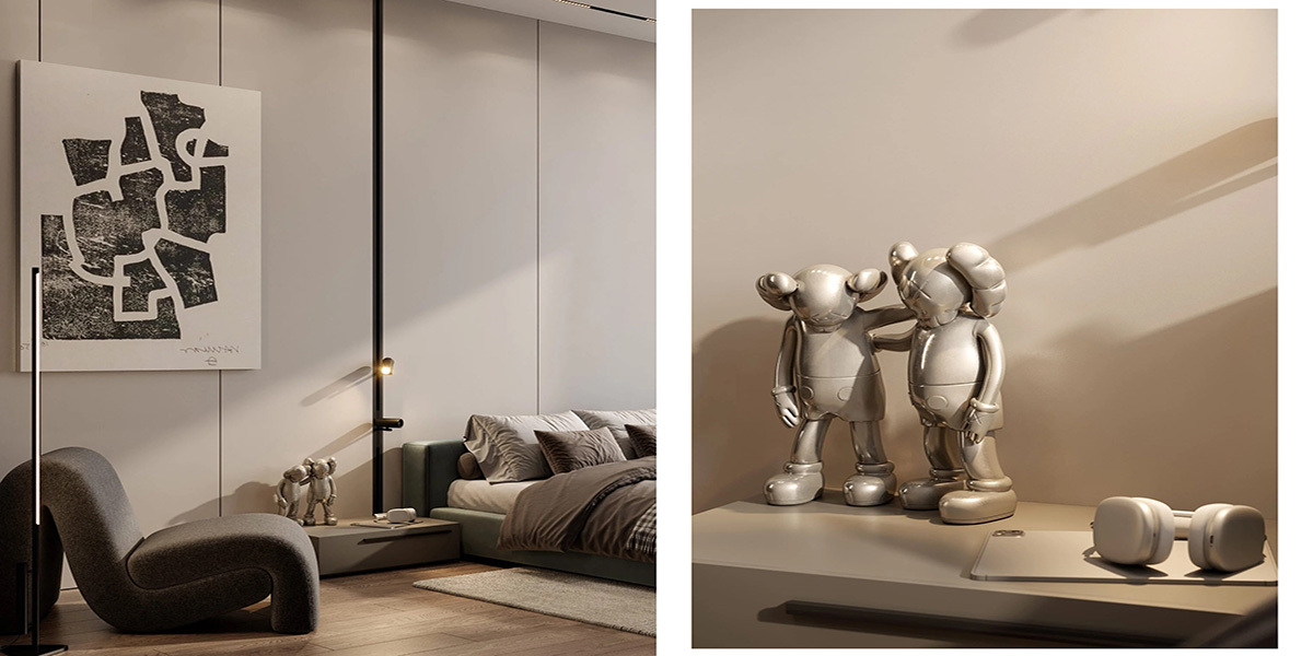 Например, если у вас есть коллекция камер или винилов, не обязательно выставлять все сразу — можно сделать стильную витрину или стеллаж, где будут только избранные экземпляры. Один наш клиент собирал коллекционные статуэтки, которых скопилось немало. Мы разместили несколько по всей квартире – на прикроватной тумбе, на полке в кабинете, в прихожей. Так получилось показать часть коллекции и при этом сохранить баланс.